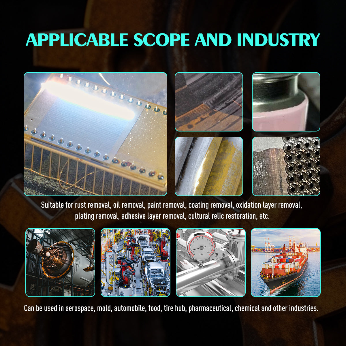 Pulse laser cleaning machine is ideal for Rust Removal,Paint Removal,Coating Removal,Oxidation Layer Removal,Plating Removal,Adhesive Layer Removal,Cultural Relic Restoration. Can be Used in Aerospace,Mold Automobile,Tile Hub,Pharmaceutical,Chemical And Other Industries.